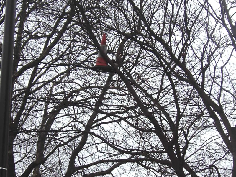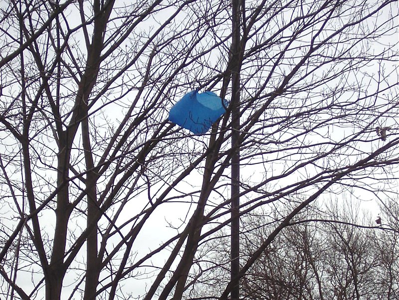 A bag in a tree.  I am not supposed to be smoking.   There are often accidents on the narrow bridge.    A bollard. In a tree.